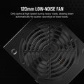 The power supply features a 120mm thermally controlled fan that adjusts speed automatically based on system temperature. This design helps maintain a quiet environment during normal workloads while keeping components cool during intense gaming or rendering sessions.
