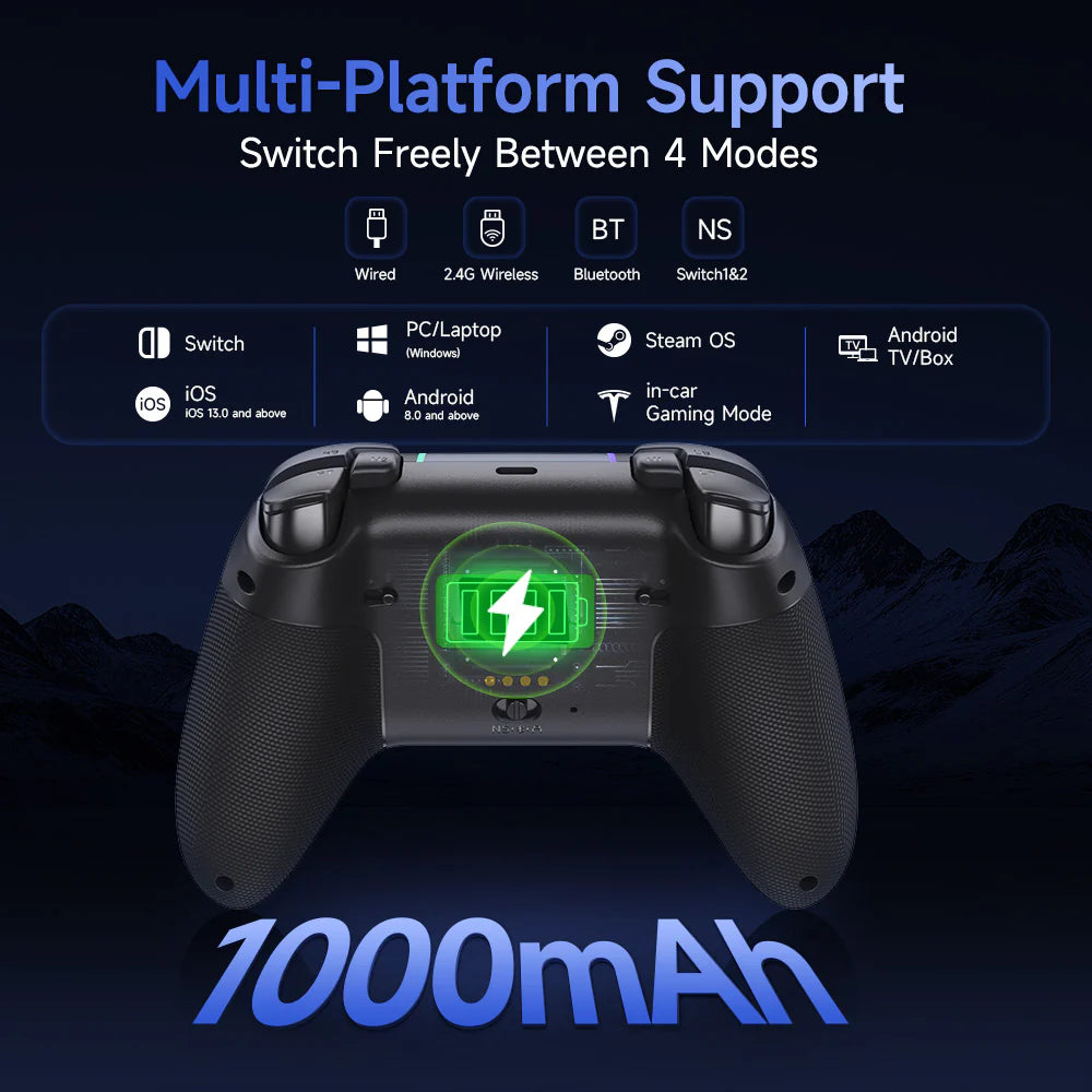 Enjoy lag-free gaming through dual connection modes — 2.4GHz wireless and Bluetooth 5.0. Instantly pair your controller with PC, Android, iOS, Nintendo Switch, or Steam Deck, ensuring smooth performance and minimal input delay.