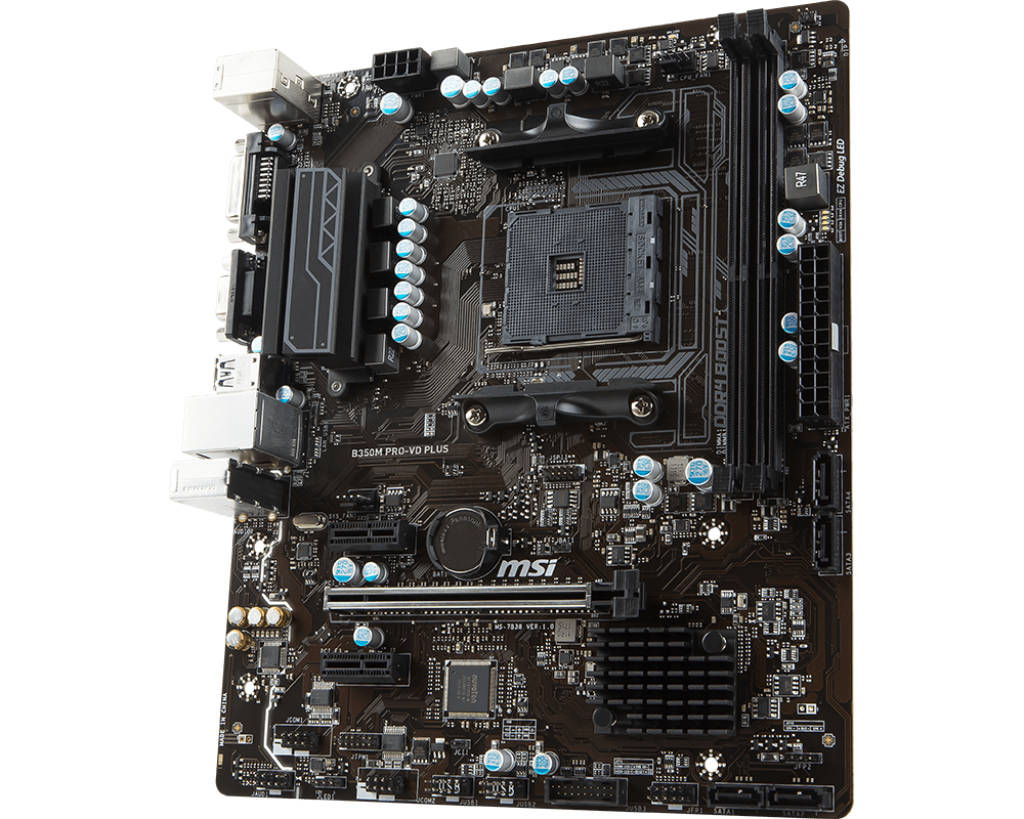 Featuring DDR4 memory support up to 3200MHz (OC), M.2 NVMe storage slot, and USB 3.1 Gen1 ports, the MSI B350M PRO-VD PLUS offers fast connectivity and responsive multitasking. Its Military Class 4 components deliver superior durability and stable voltage under heavy gaming or workload sessions. With Audio Boost technology, it provides crystal-clear sound for immersive gameplay or media use.