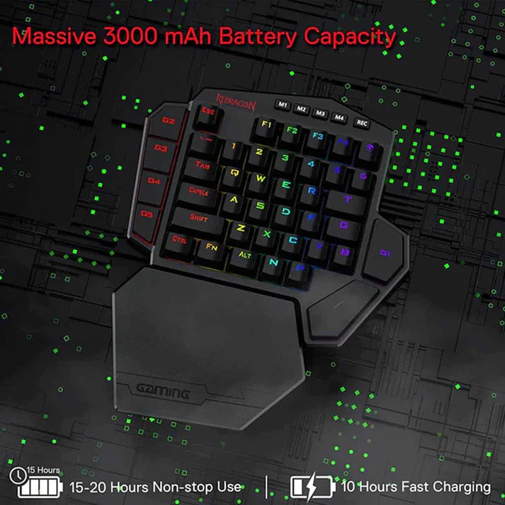 The Redragon Diti Elite RGB Wireless One-Handed Gaming Keyboard is built for pro-level gamers who need performance, speed, and style—all in one compact powerhouse. This ergonomic one-handed keyboard is perfect for FPS, MOBA, and battle royale titles, offering ultra-fast actuation and fully programmable keys to keep you ahead of the competition.