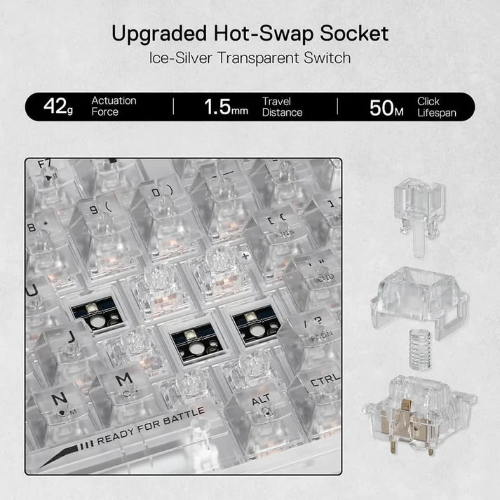 Built in a stunning white compact layout, this 75% keyboard saves space while maximizing functionality. Enjoy lag-free wireless performance via Bluetooth 5.0 or 2.4GHz, or switch to USB-C wired mode for uninterrupted gameplay. With hot-swappable switch support, you can easily customize your typing experience on the fly.