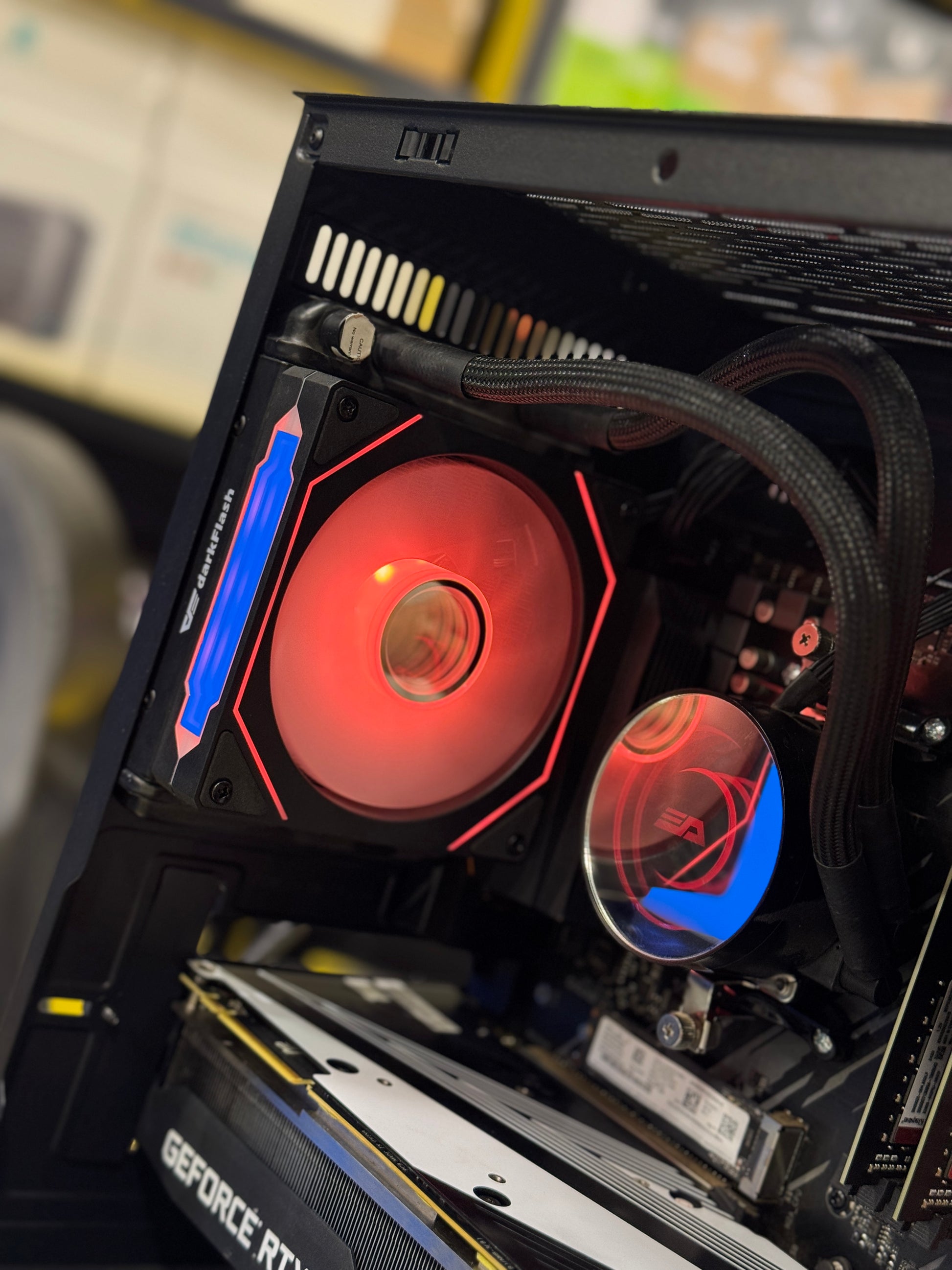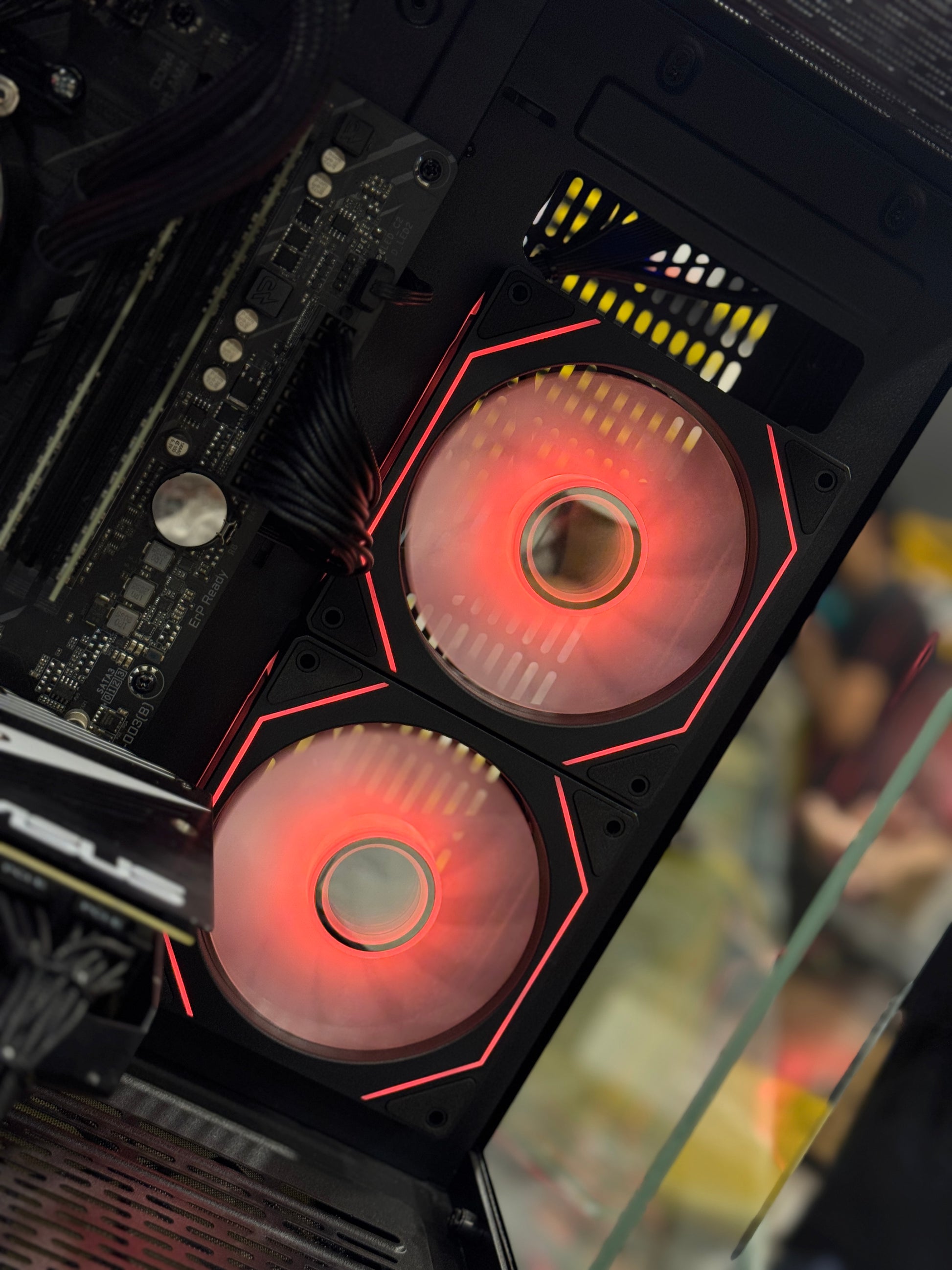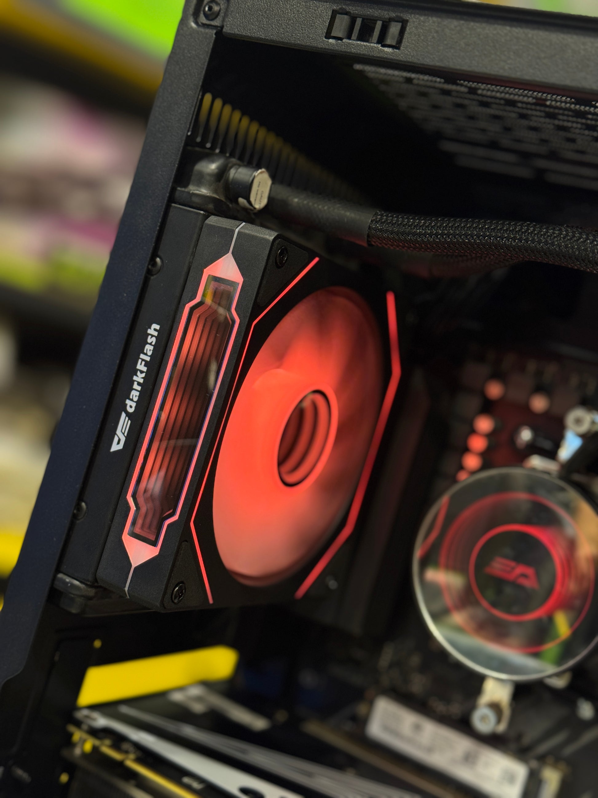 This build features a Dark Flash 120 mm ARGB Liquid Cooler paired with 3 Infinity Fans to maintain optimal thermals and a premium RGB look.